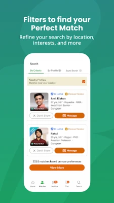 உங்கள் சுயவிவரத்தை உருவாக்குவதுடன் இந்தப் பயணம் தொடங்குகிறது. கோடிக்கணக்கான மணமக்களின் சுயவிவரங்களை ஆராய்ந்து, உங்களுக்கான சிறந்த துணையை அடையாளம் காணும் வாய்ப்பை "Bharat Matrimony" வழங்குகிறது. எங்கள் நவீன செயற்கை நுண்ணறிவு சார்ந்த தொழில்நுட்பம், உங்கள் எதிர்பார்ப்புகளுக்கேற்ப துல்லியமான பரிந்துரைகளை வழங்குகிறது. புதிய பொருத்தங்கள், உங்கள் சுயவிவரத்தில் ஆர்வம் காட்டுபவர்கள் அல்லது உங்கள் பதில்களுக்குக் காத்திருக்கும் வாய்ப்புகள் குறித்த அறிவிப்புகளை நீங்கள் உடனுக்குடன் பெறுவீர்கள். நகரம், கல்வித் தகுதி, பணி விவரம் மற்றும் பல அம்சங்களின் அடிப்படையில் உங்கள் எதிர்பார்ப்புகளுக்கு ஏற்ப சரியான துணையைத் தேர்வுசெய்ய எங்கள் மேம்பட்ட தேடல் வடிப்பான்கள் உதவுகின்றன.