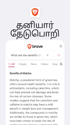 100 மில்லியனுக்கும் மேற்பட்டோர் பயன்படுத்தும் Brave (பிரேவ்) உலாவி, பாதுகாப்பான, தனிப்பட்ட இணைய அனுபவத்தை வழங்குகிறது. உள்ளமைந்த விளம்பரத்தடுப்பான் மற்றும் VPN மூலம், தேடும்போது தடமறிபவர்களையும் விளம்பரங்களையும் இயல்பாகவே தடுத்து, உங்கள் தனியுரிமையைப் பாதுகாக்கிறது.