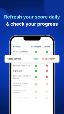 GoodScore செயலி உங்கள் Credit score-ஐ மேம்படுத்த வடிவமைக்கப்பட்டது. நிதி நிலைத்தன்மையை அடைய சிறந்த Credit score உருவாக்க இது உதவும். வெறும் CRIF score சரிபார்ப்பதைத் தாண்டி, உங்கள் நிதி நிலைக்கு உறுதுணையாகும்.
