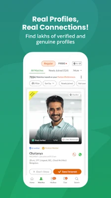 உங்கள் திருமணப் பயணத்தைத் தொடங்க கன்னட மேட்ரிமோனியில் இலவசமாகப் பதிவு செய்யுங்கள். இதன் மூலம் உங்கள் சுயவிவரத்தை உருவாக்கி, லட்சக்கணக்கான பொருத்தமான வரன்களை உலாவலாம். எங்கள் சக்திவாய்ந்த MIMA™ எனப்படும் செயற்கை நுண்ணறிவு சார்ந்த பொருத்தும் வழிமுறை, உங்கள் விருப்பங்களுக்கு ஏற்ற துணையைத் துல்லியமாகப் பரிந்துரைக்கிறது. புதிய பொருத்தங்கள், உங்கள் சுயவிவரத்தில் ஆர்வம் காட்டுபவர்கள் அல்லது உங்கள் கேள்விக்கு பதிலளிப்பவர்கள் குறித்த அறிவிப்புகளை உடனுக்குடன் உங்கள் கைப்பேசியில் பெறுவீர்கள். மேலும், மேம்பட்ட வடிகட்டிகளைப் பயன்படுத்தி, நகரம், கல்வி, தொழில், இருப்பிடம் போன்ற பல்வேறு அளவுகோல்களின் அடிப்படையில் உங்கள் பொருத்தமான துணையைத் தேடும் வசதியையும் கன்னட மேட்ரிமோனி வழங்குகிறது.