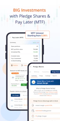 உங்கள் வர்த்தகங்களுக்கு ஆற்றல் சேர்க்க, Pay Later (MTF), பங்குகளை அடகு வைத்தல் (Pledge Shares) மற்றும் உடனடி மார்ஜின் போன்ற பலன்களை m.Stock வழங்குகிறது, இது சந்தையில் நீங்கள் ஒரு படி மேலே இருக்க உதவும். m.Stock-ஐ தேர்ந்தெடுக்கும் வர்த்தகர்கள், ஈக்விட்டி டெலிவரி, மியூச்சுவல் ஃபண்டுகள் மற்றும் ஐபிஓ முதலீடுகளுக்கு பூஜ்ஜிய தரகு கட்டணத்தையும், இன்ட்ராடே வர்த்தகம், F&O மற்றும் MTF-க்கு ஆர்டருக்கு ₹5/- என்ற குறைந்த கட்டணத்தையும் பெறுகிறார்கள். SBI, HDFC, ICICI, Axis மற்றும் பல முன்னணி AMC-களிலிருந்து நேரடி மியூச்சுவல் ஃபண்டுகளில் முதலீடு செய்து, உங்கள் முதலீட்டுத் திட்டங்களை வலுப்படுத்தலாம்.